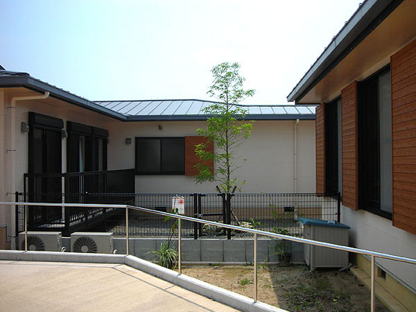 木造 三角小規模多機能施設5、既存のグループホームとの間は中庭で、各棟居室間の緩衝帯としています